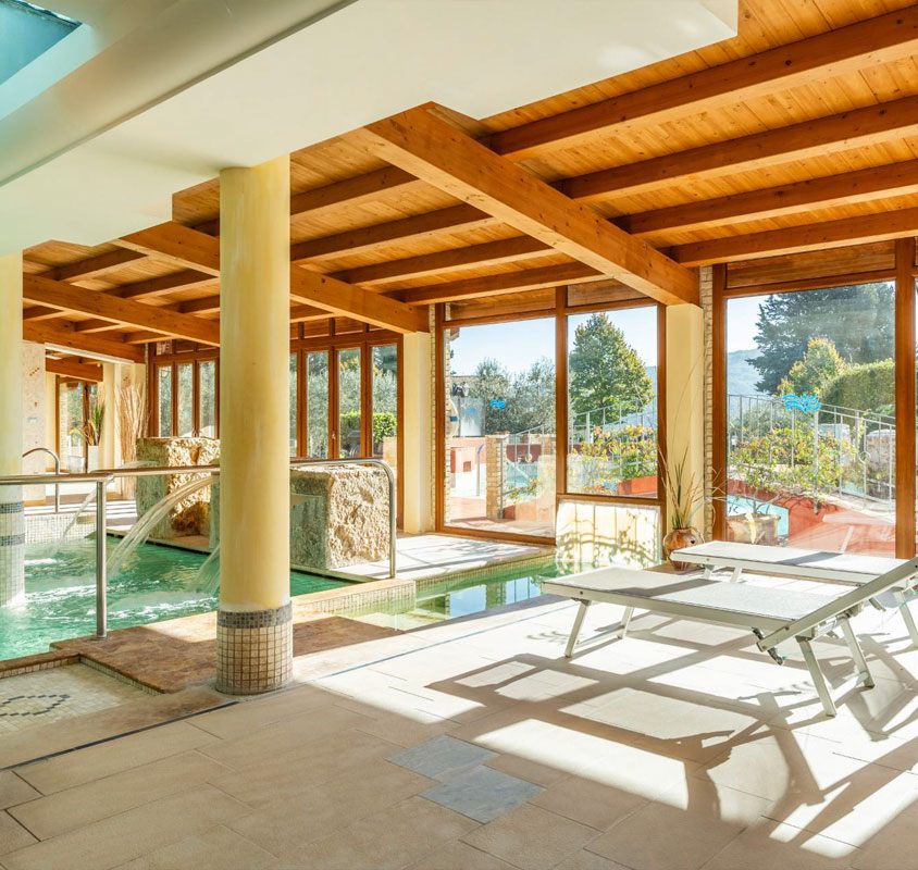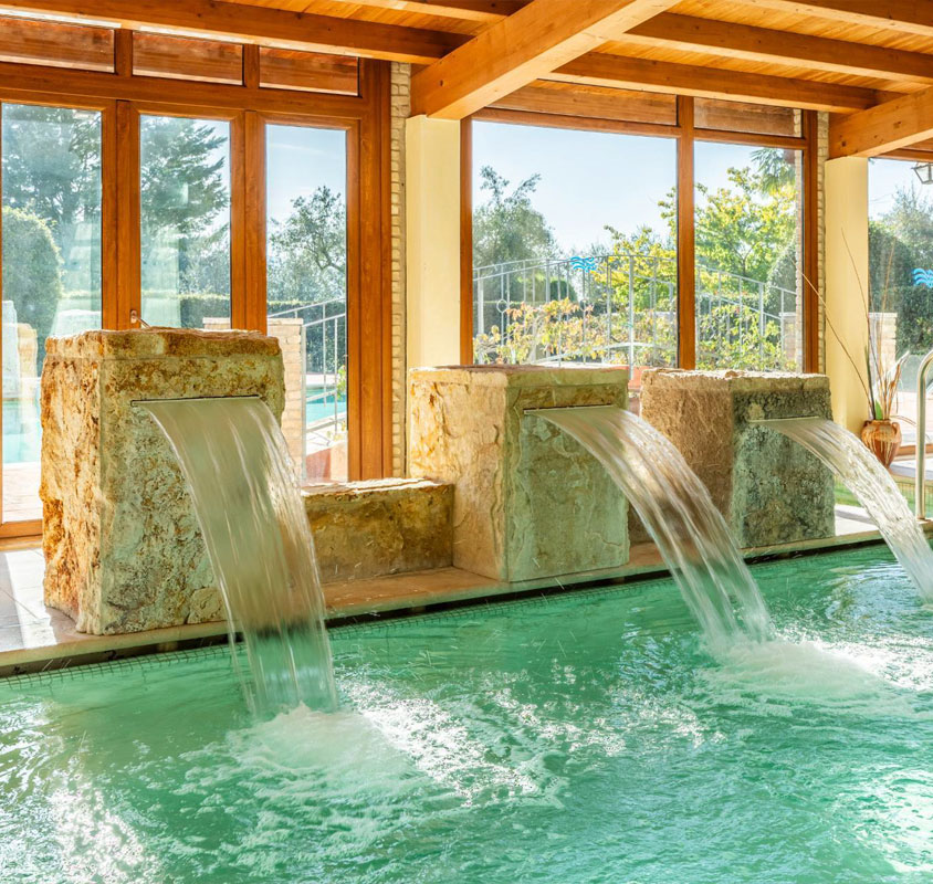 Quattro piscine termali — due interne e due esterne — con idromassaggi, percorso Kneipp, sauna finlandese e bagno turco: il centro termale di Villa Valentina SPA offre tutto ciò che serve per rigenerarsi in qualunque periodo dell’anno.